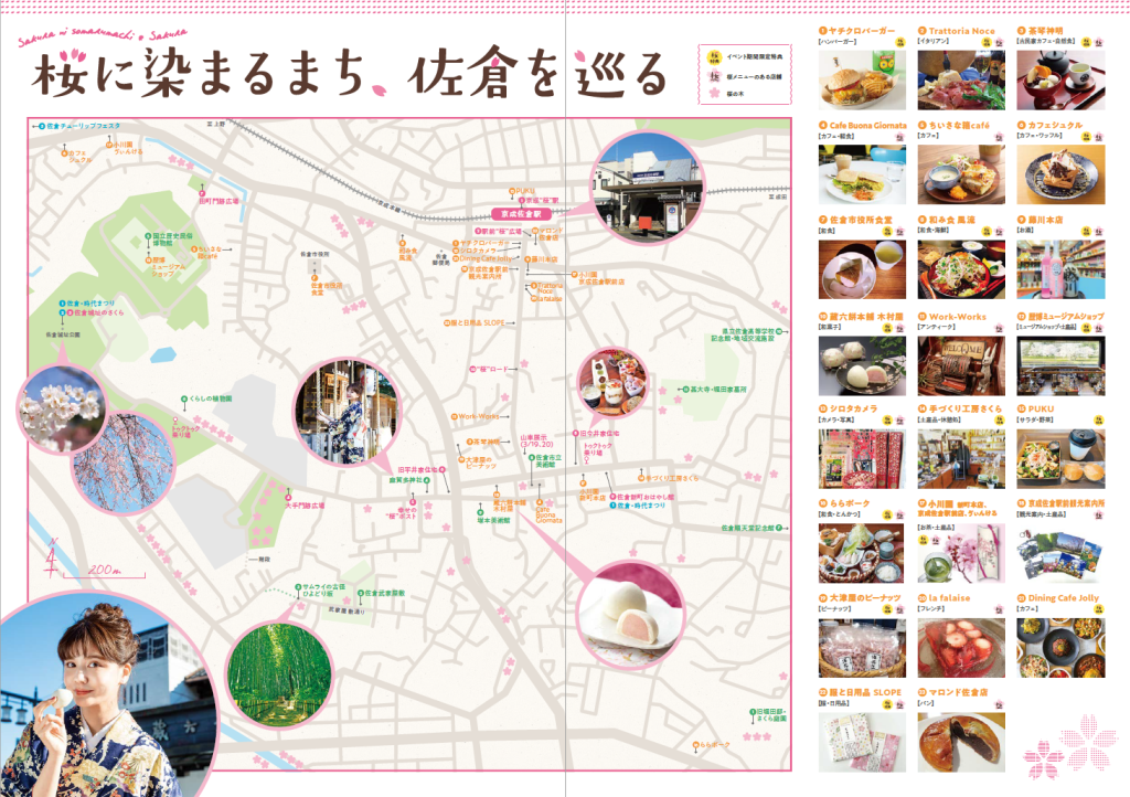 会場周辺の桜の木やイベント会場、飲食店、観光スポットが掲載されたまち歩きに便利なマップを作成、配布します。