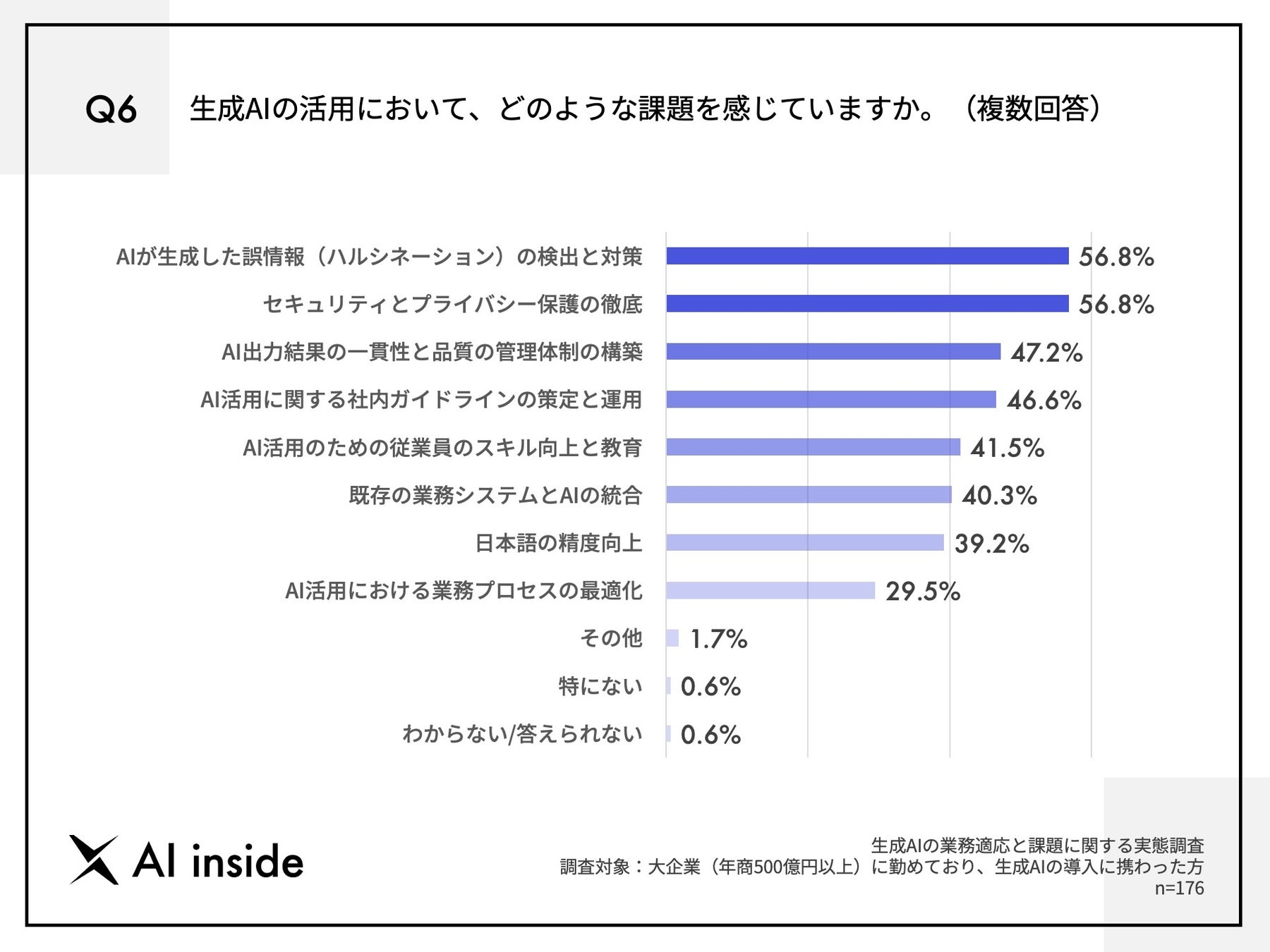 Q1で「全社的に本格活用中」「一部の部門で活用中」「試験的に活用中(PoC実施中含む)」と回答した方に、「Q6.生成AIの活用において、どのような課題を感じていますか。(複数回答)」(n=176)と質問したところ、「AIが生成した誤情報(ハルシネーション)の検出と対策」が56.8%、「セキュリティとプライバシー保護の徹底」が56.8%、「AI出力結果の一貫性と品質の管理体制の構築」が47.2%という回答となりました。