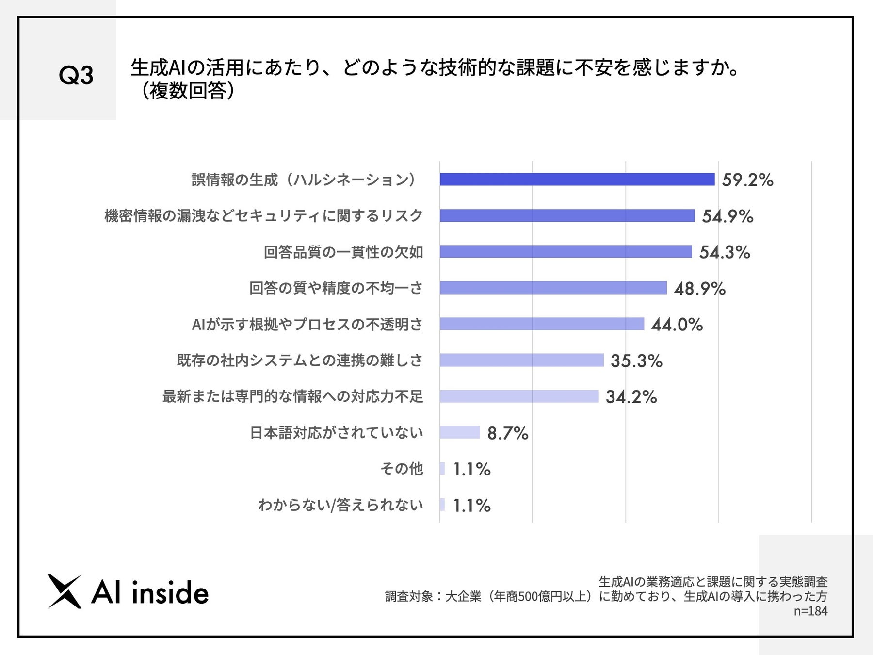 Q2で「非常に感じている」「やや感じている」と回答した方に、「Q3.生成AIの活用にあたり、どのような技術的な課題に不安を感じますか。(複数回答)」(n=184)と質問したところ、「誤情報の生成(ハルシネーション)」が59.2%、「機密情報の漏洩などセキュリティに関するリスク」が54.9%、「回答品質の一貫性の欠如」が54.3%という回答となりました。