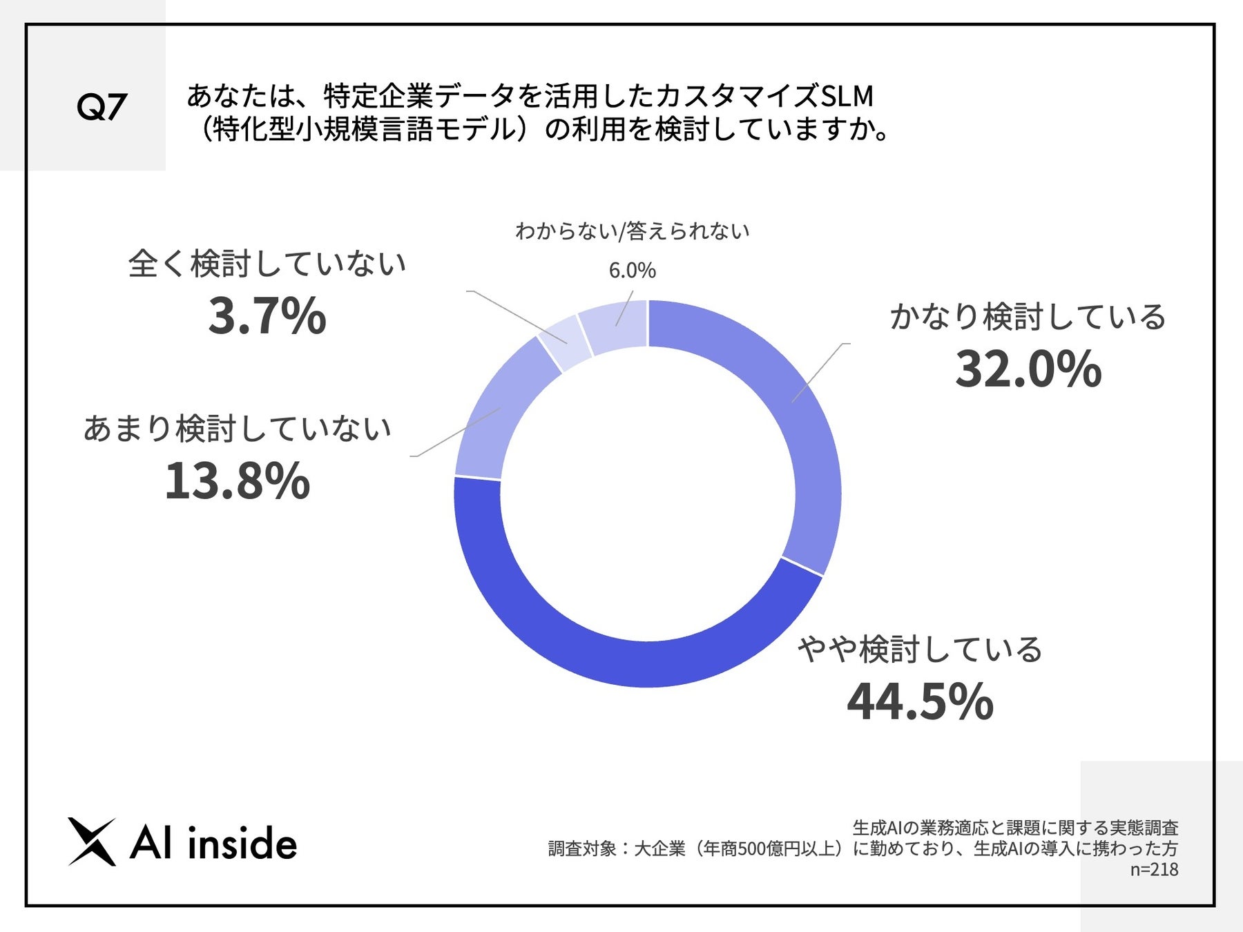 「Q7.あなたは、特定企業データを活用したカスタマイズSLM(特化型小規模言語モデル)の利用を検討していますか。」(n=218)と質問したところ、「かなり検討している」が32.0%、「やや検討している」が44.5%という回答となりました。