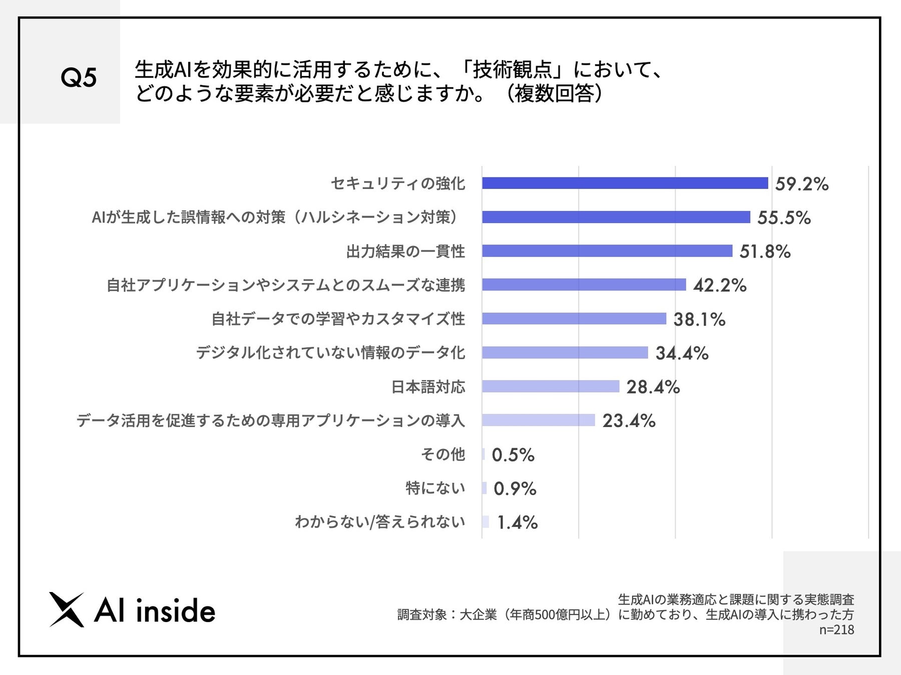 「Q5.生成AIを効果的に活用するために、技術観点において、どのような要素が必要だと感じますか。(複数回答)」(n=218)と質問したところ、「セキュリティの強化」が59.2%、「AIが生成した誤情報への対策(ハルシネーション対策)」が55.5%、「出力結果の一貫性」が51.8%という回答となりました。