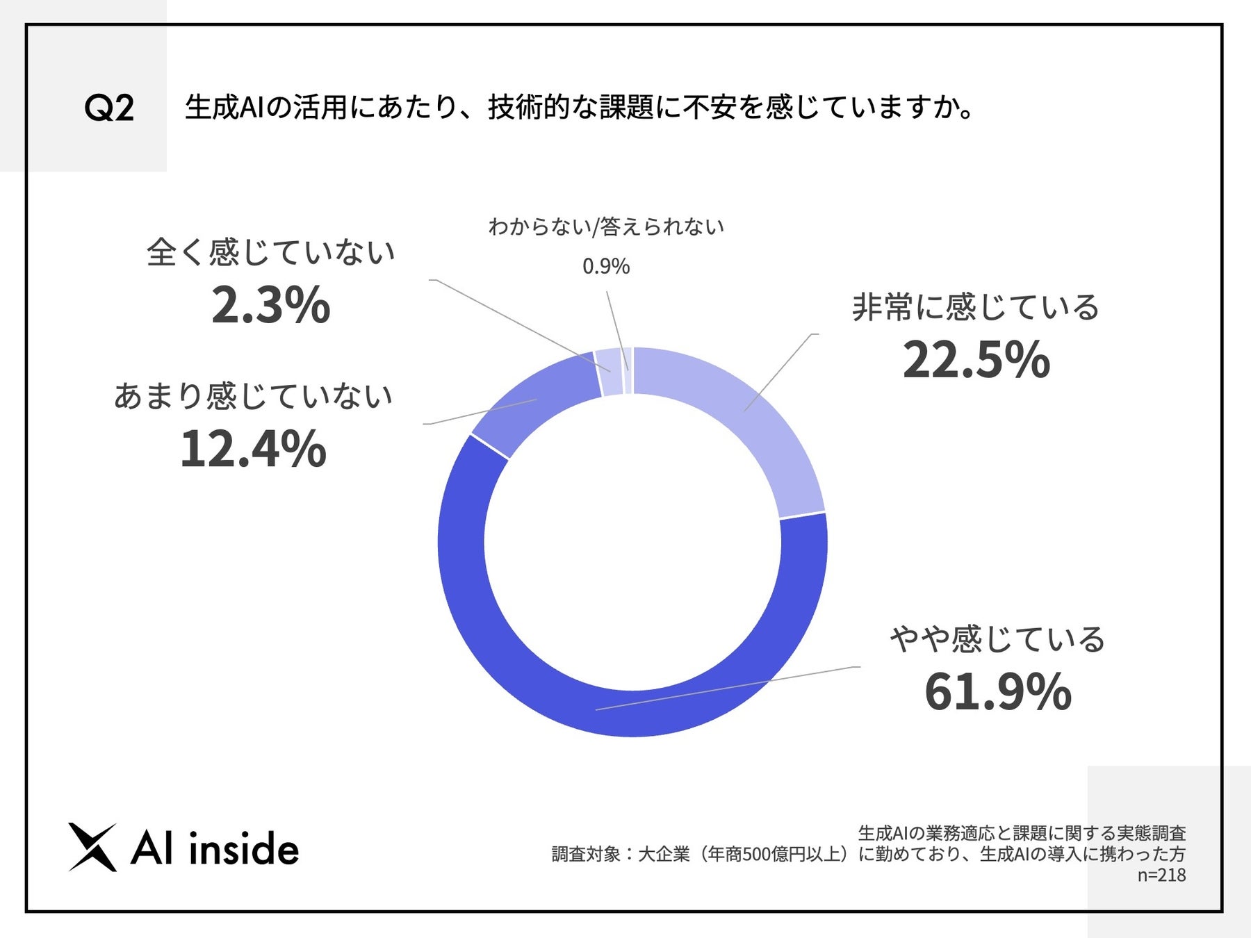 「Q2.生成AIの活用にあたり、技術的な課題に不安を感じていますか。」(n=218)と質問したところ、「非常に感じている」が22.5%、「やや感じている」が61.9%という回答となりました。