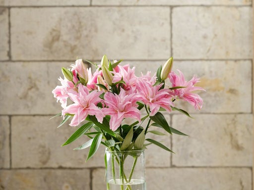 鮮度の高いmini八重ユリのブーケです。質の良いユリが育つよう、土には化成肥料を一切投入せず有機肥料のみを使用するなど、土づくりにもこだわっています。