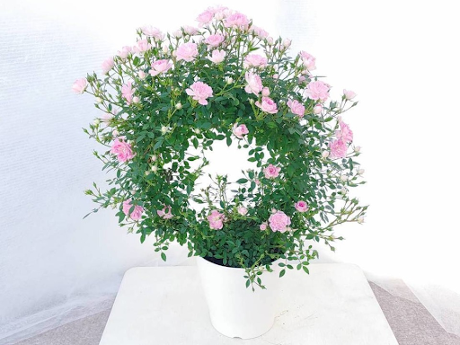 夢乙女(ミニクライミングローズ)を円満をイメージしたリング上に巻き上げ、バラがリング全体に咲き誇るよう仕立てた鉢植えです。