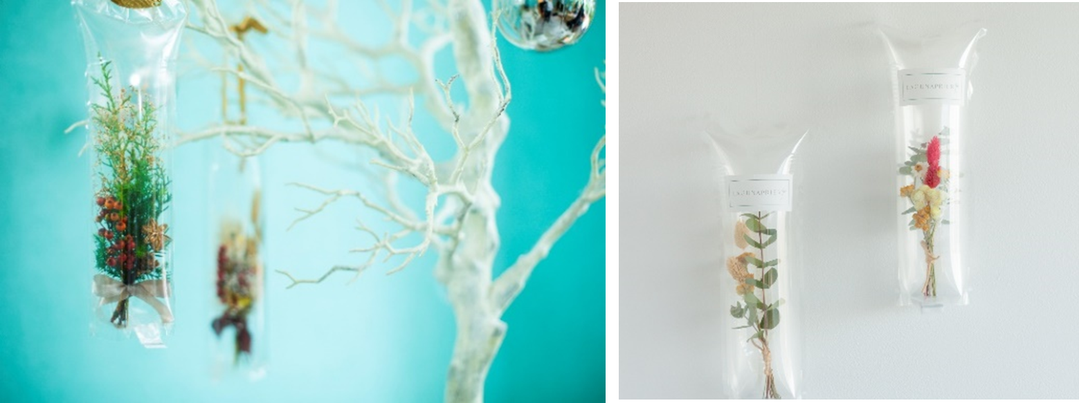 生花とは違った色味や質感のエアフルール加工をしたドライフラワーは、このまま飾ってもオーナメントとして