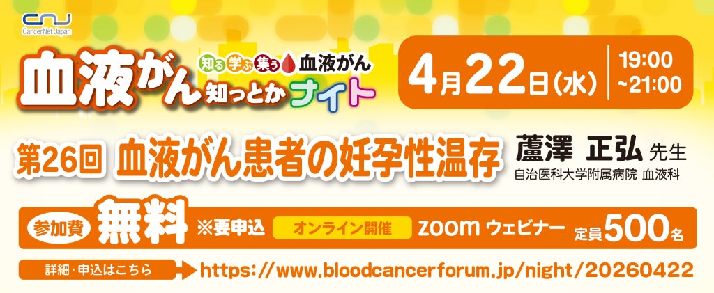 認定 NPO 法人キャンサーネットジャパン(東京都文京区 理事長 岩瀨 哲)は、2023年より毎月1回、血液がんに関するオンラインセミナー「血液がん知っとかナイト」を実施しています。26回目の開催となる2026年4月は「血液がん患者の妊孕性温存」をテーマに開催する運びとなりました。