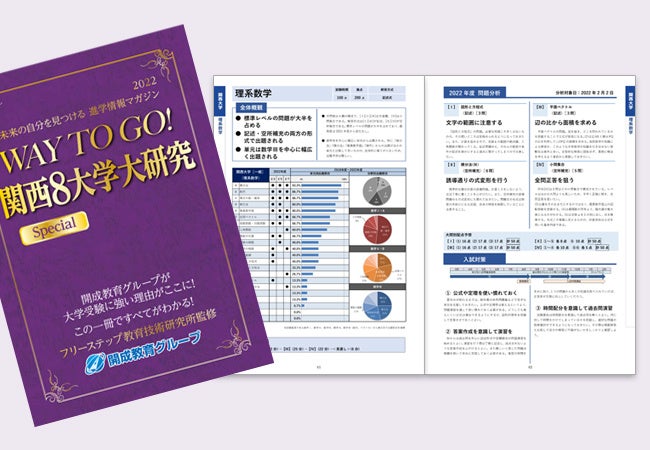 入試傾向、分析、解法、大学受験までのスケジュールや併願パターンなど、大学受験に関わる情報が満載の情報誌(デジタル版)を参加者全員にプレゼント。関西版384ページ、関東版224ページで受験に関する情報が惜しみなく詰め込まれた一冊で、参加生徒はもちろん、高校教員参加者からも好評いただいているフリーステップ教育技術研究所の研究成果が満載の情報誌になっている。