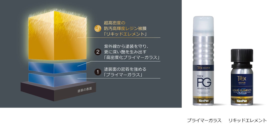 この圧倒的な防汚高輝度レジン被膜「リキッドエレメント」の下に、塗装面の密着を強め、深い艶を生み出す「プライマーガラス」と、紫外線から塗装を守り、更に深い艶を生み出す「高密度化プライマーガラス」による重層のコーティング膜を構成。