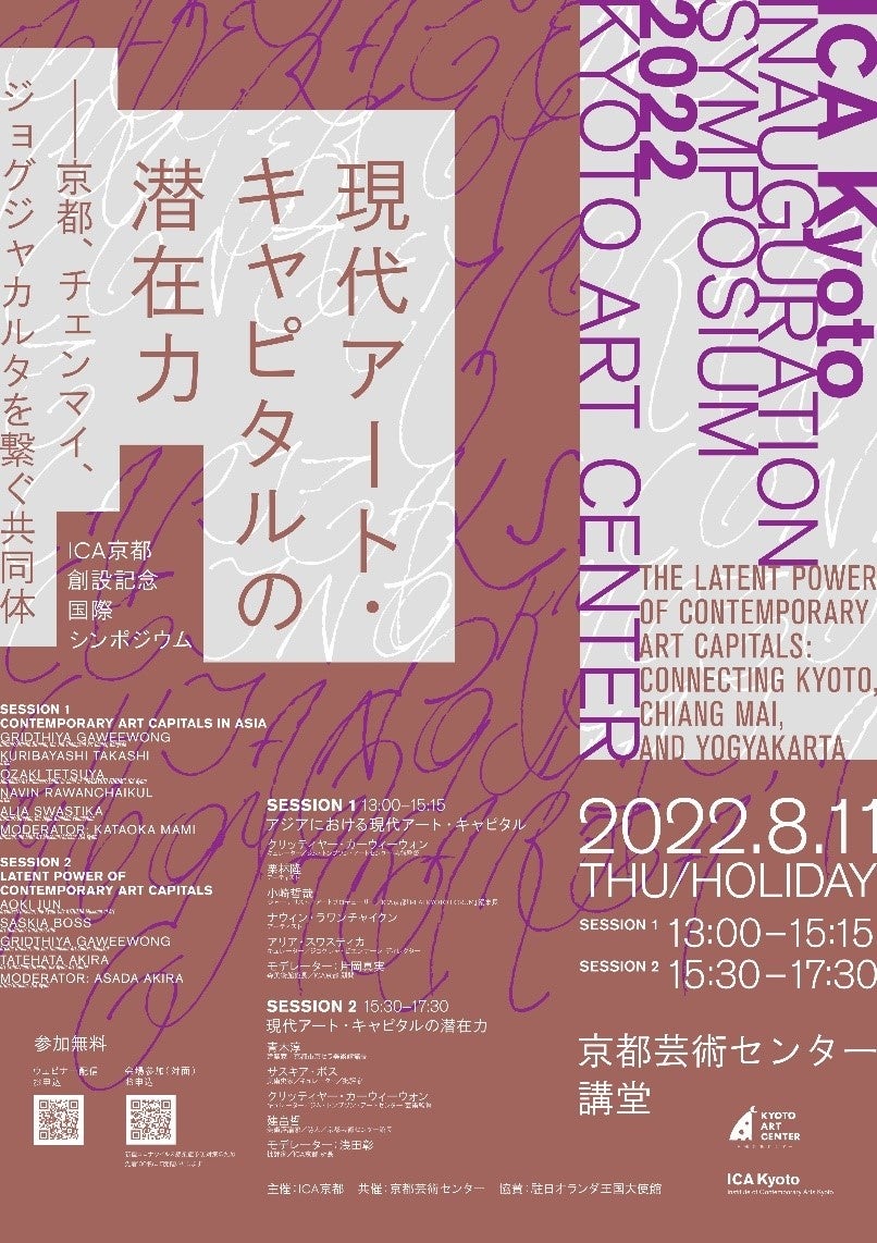 浅田彰(京都芸術大学教授)が所長を務める現代アートの研究機関 京都芸術大学 ICA京都(Institute of Contemporary Arts Kyoto)が、グローバルに活躍するアーティストの拠点、タイのチェンマイ、インドネシアのジョグジャカルタと比較しつつ、京都の潜在力を探る国際シンポジウムを、8月11日(木・祝)に京都芸術センターにて開催します。