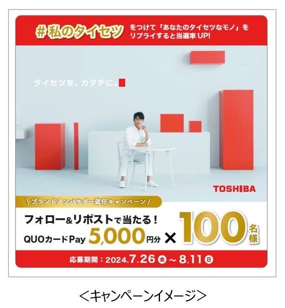 反町隆史さんのアンバサダー就任を記念し、オリジナルデザインQUOカードpay5,000円分を100名様にプレゼントするキャンペーンを2024年7月26日(金)から8月11日(日)まで、当社公式Xアカウント(@TOSHIBA_LS)で実施します。