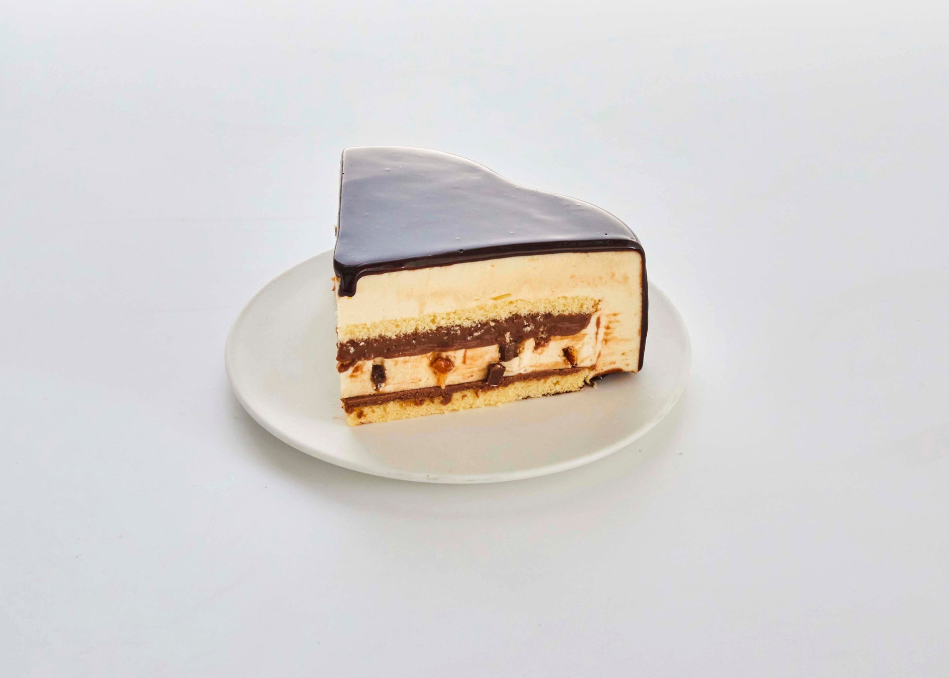 ふわふわのスポンジにアーモンドミルクやチョコレートのなめらかなムースを重ね、艶やかにコーティングしました。