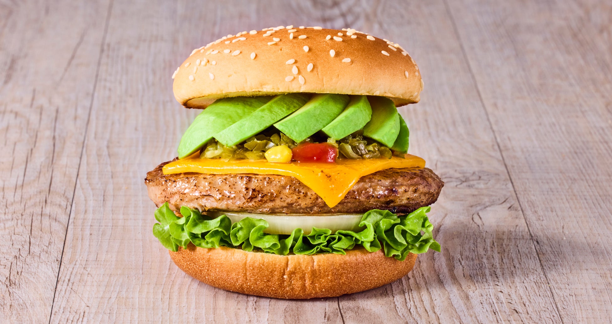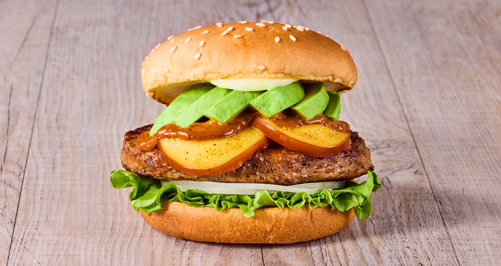 クォーターパウンド(113g)の肉厚ジューシーなビーフパティと、コクのある厚切りスライスのレッドチェダーチーズ、生アボカドを豪快に1/2個サンドしました。シャキシャキ食感の国産生野菜も入っており、食べ応えがありつつも女性からの人気が高い一品です。