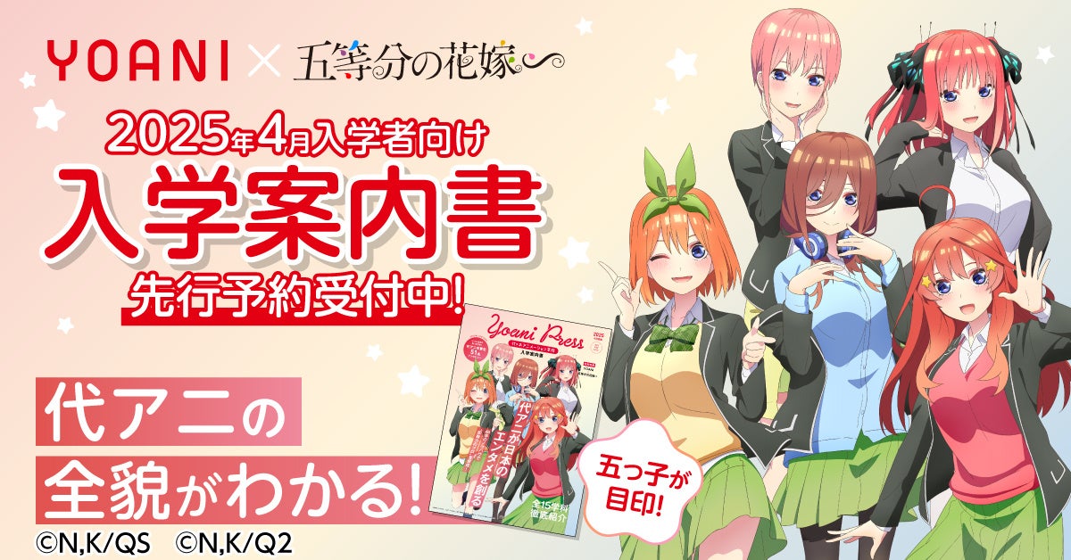 株式会社代々木アニメーション学院(本社:東京都千代田区 代表取締役社長:橋本大輝)は、2024年8月1日(木)より、TVスペシャルアニメ「五等分の花嫁∽」とコラボした「2025年4月入学者向け入学案内書」の先行予約を開始することをお知らせいたします。
