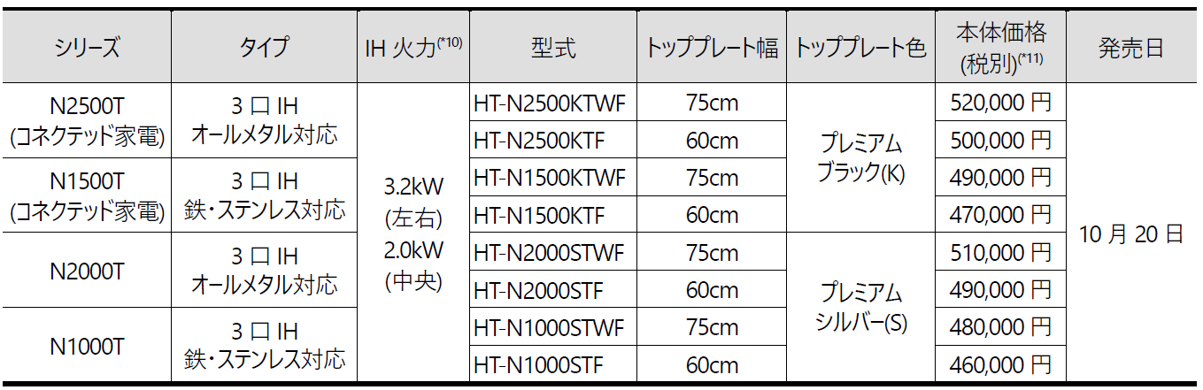 (*10) 鉄・ステンレス鍋加熱時、火力(W)は入力値です。オールメタル対応N2500T・N2000Tシリーズ(右IH)はアルミ・銅鍋加熱時2.6kW。