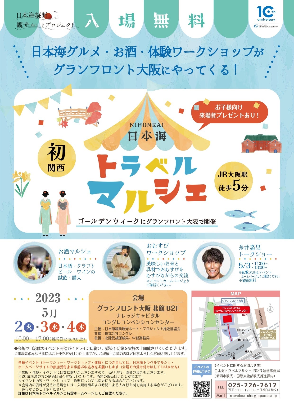 ゴールデンウイーク期間中の3日間限定で開催する『日本海トラベルマルシェ』は、日本海沿線各地のグルメが味わえる日本最大級の日本海イベントで、本プロジェクトのイベントを関西で実施するのは初めての取り組みです。各地の観光名所の紹介とともに、特産品・工芸品などの販売、日本酒やクラフトビール、ワインなどを試飲したり購入することができるお酒マルシェ、各地のおいしいお米と具材でにぎるおむすびワークショップをはじめ、お子様から大人までお楽しみいただけるイベントを開催し、大阪に居ながら日本海エリアを一度に体感いただけます。