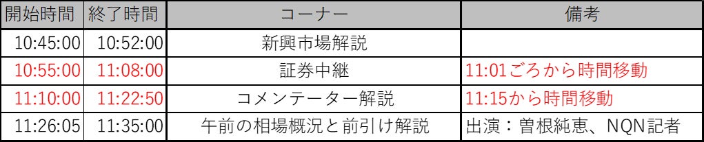 変更内容:午前の取引終了前後のもようは、「昼エクスプレス」でお馴染みの曽根純恵と日経QUICKニュース(=NQN)の記者がお伝えします。広い視点で東京市場の動きを追う曽根キャスターと、国内外の金融市場や上場企業などのニュースをリアルタイムで報道するNQNの記者による深いマーケット解説を視聴者の皆さまに毎日お届けします。