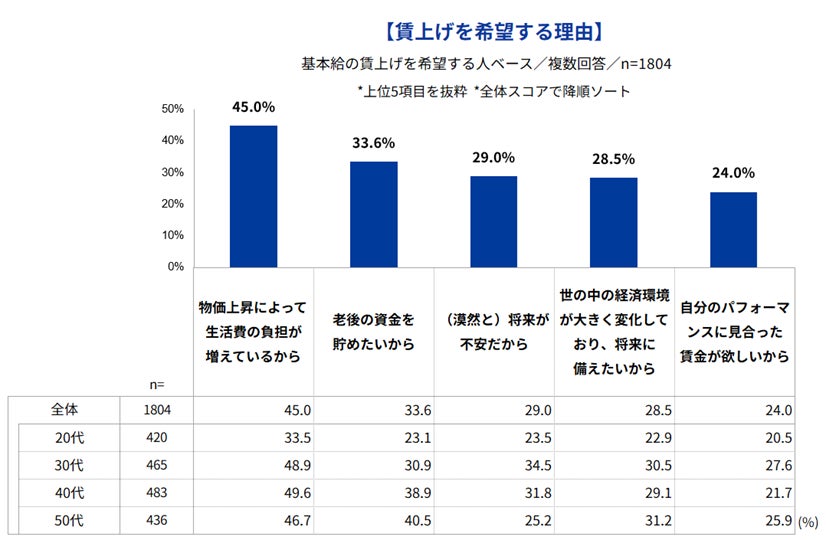 賃上げ希望理由の最多は、全世代共通で「物価上昇によって生活費の負担が増えているから」(全体45.0%)。2番目に多い理由は40代・50代は「老後の資金を貯めたいから」(全体33.6%)、20代・30代は「(漠然と)将来が不安だから」(全体29.0%)。
