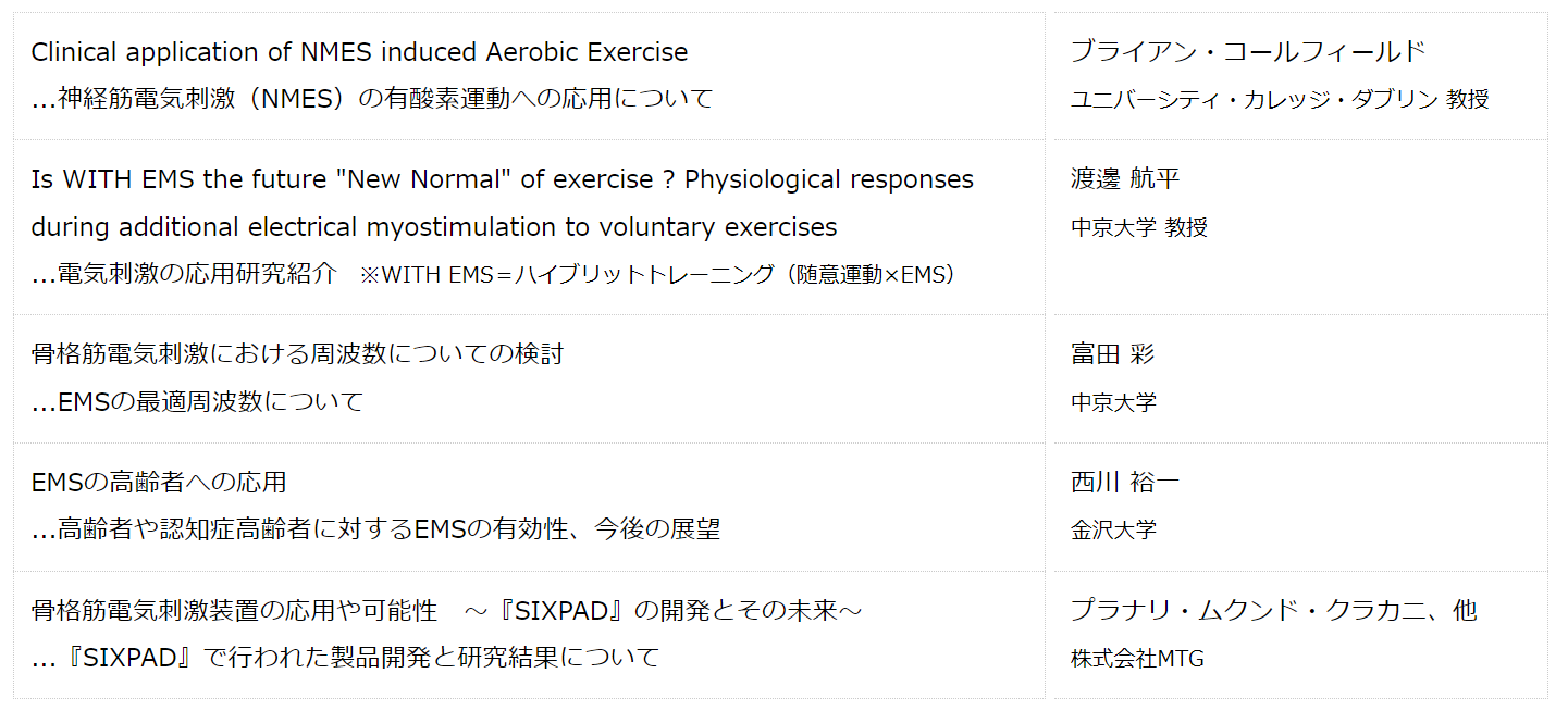 株式会社MTG(本社:愛知県名古屋市、代表取締役社長:松下剛)は、全世界を対象に2年に1度開催される電気生理学および運動学の国際学会「 ISEK(アイセック/国際電気生理運動学会)」が主催する「ISEK2020」にて、EMS※に関する研究成果を発表しました。また、EMSに関するワークショップを主催し、EMSを中心としたトレーニング・ブランド『SIXPAD(シックスパッド)』の開発パートナーである中京大学 教授 渡邊航平氏、ユニバーシティ・カレッジ・ダブリン 教授 ブライアン コールフィールド氏など各専門家とともに、電気刺激に関する研究成果等の発表も行いましたので、概要についてお知らせします。