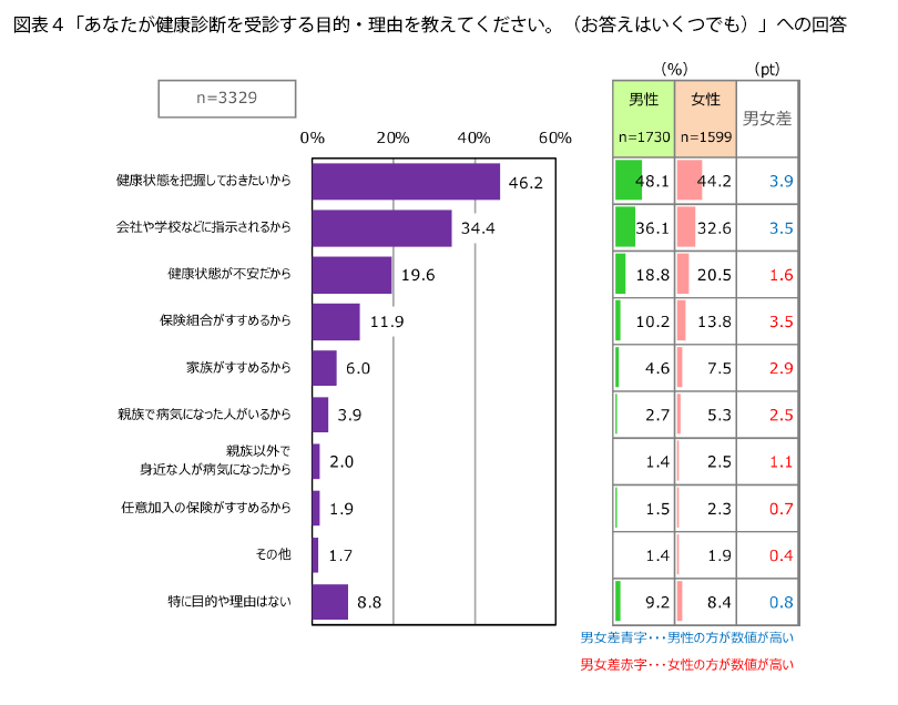 健康診断を受診する目的や理由を尋ねると(図表4)、最も割合が高かったのは「健康状態を把握しておきたいから」(46.2%)、次が「会社や学校などに指示されるから」(34.4%)でした。複数回答可の質問ですが、「健康状態が不安だから」と回答した人は19.6%と、そこまで高い割合ではありません。