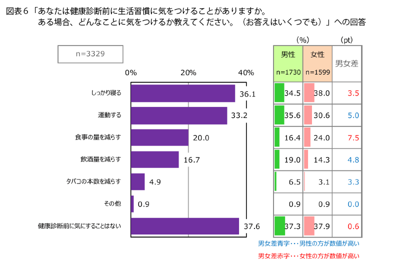 健康診断前に生活習慣に気をつけることがあるかを聞くと(図表6)、「健康診断前に気にすることはない」という人は37.6%でした。残りの6割強の人たちは、健康診断を意識して、行動に何らかの変化が生じるようです。