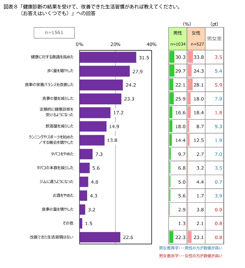「改善できた生活習慣はない」という人も22.6%いましたが、残りの8割近い人は、なんらかの改善につながったようです。これだけでも、健康診断が人々の健康に与える影響の大きさがわかります。
