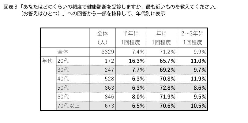 次に、健康診断を受ける頻度については(図表2)、最も割合が高いのが「年に1回程度」の71.2%でした。「半年に1回程度」、「年に1回程度」、「2〜3年に1回程度」と回答した人を年代別に見ると(図表3)、20代は「半年に1回程度」と回答した割合がほかより高くなっていますが、そのほかは年代間であまり差がありません。