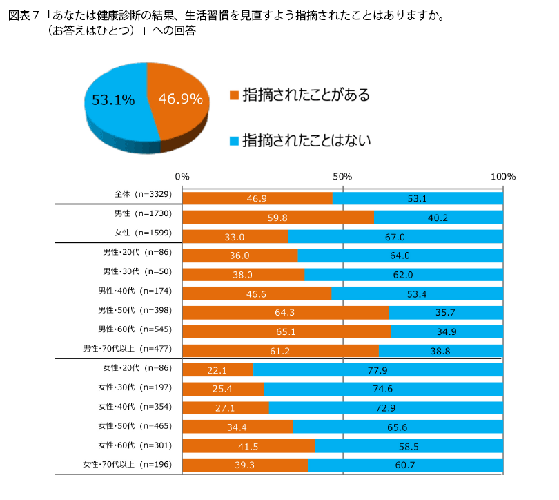 健康診断の結果、生活習慣を見直すように指摘されたことがある人は、全体では46.9%と、半数近くになりました(図表7)。