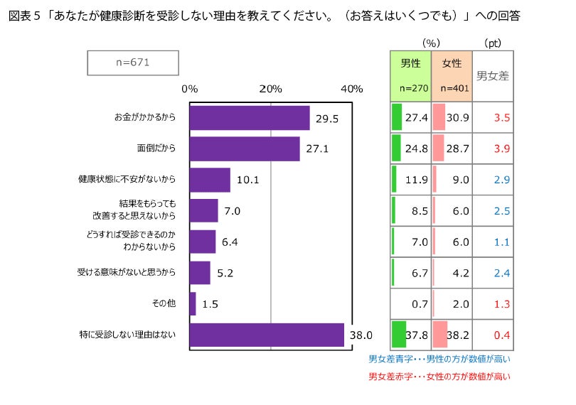 逆に、健康診断を受診したことがない人に、受診しない理由を聞くと(図表5)、「特に受診しない理由はない」と回答した人が38.0%で最も多かったのですが、次いで、「お金がかかるから」(29.5%)、「面倒だから」(27.1%)がほぼ差がなく並んでいます。「健康状態に不安がないから」は10.1%に留まっていますが、不安がないからこそ、お金や時間がかかる健診をわざわざ受診したくない、という心理もあるのではないでしょうか。