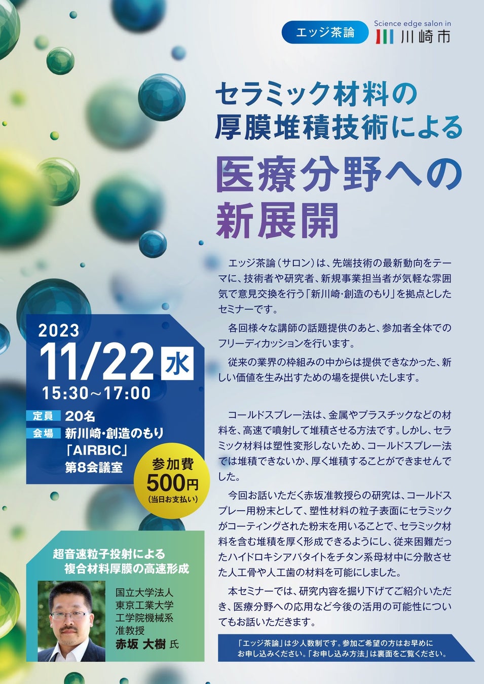【11/22開催】第1回エッジ茶論のご案内:セラミック材料の厚膜堆積技術による医療分野への新展開