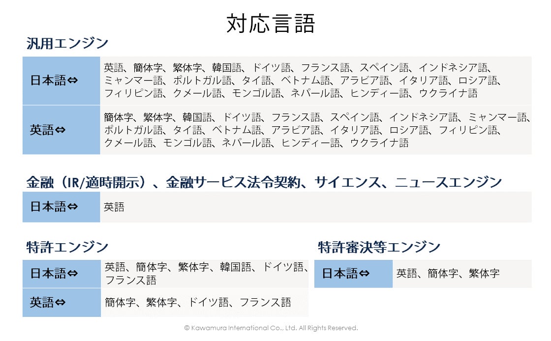 利用可能な翻訳エンジン:汎用/特許/金融(IR/適時開示)/金融サービス/法令契約 /サイエンス/特許審決等/ニュース 8つ全てのエンジン