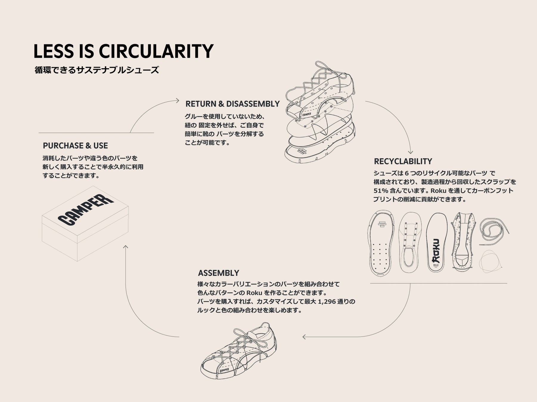 「A Little better, Never perfect(少しずつより良く。でも、完成形はない。)」をスローガンに、よりサステナブルな未来の実現を目指すカンペールは、シーズンごとに環境に配慮したオプションを広げ、余剰なゴミを出さずに、長く愛用できるシューズ作りに挑戦し続けています。なかでも、今年デビューした「ROKU」はカンペールのサステナブルな精神を最も忠実に実現したラインとなります。「ROKU(ロク)」は日本語の"6"を意味し、単なる靴ではなく、無限に履くことのできる靴として開発されたシューズです。カンペールの長年のアイコンである「WABI(ワビ)」のコンセプトを受け継ぎ、現代的な感覚で表現しています。