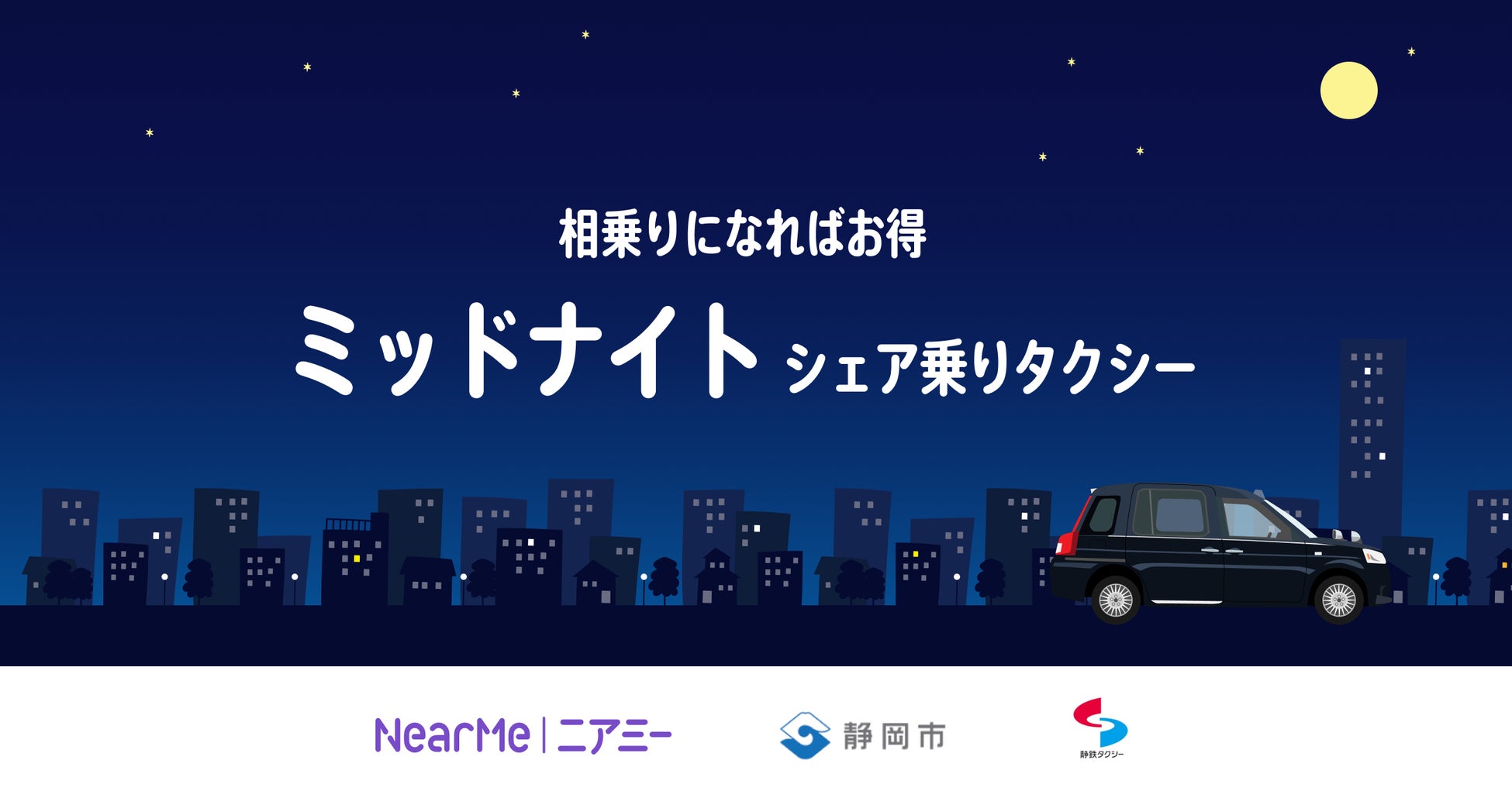 移動に関する課題解決に取り組むソーシャルデザインカンパニー、株式会社NearMe(本社:東京都中央区、代表取締役社長:髙原幸一郎、以下「ニアミー」)は、電車やバスが運行していない早朝及び深夜帯における移動手段として「ミッドナイトシェア乗りタクシー」を本日、2月14日(金)から静清交通圏で開始します。なお、本サービスは、静岡市(市長:難波 喬司)が主催する新社会システム共創コンテスト「知・地域共創コンテスト」で優秀賞を獲得したビジネスプランをもとに展開するものです。