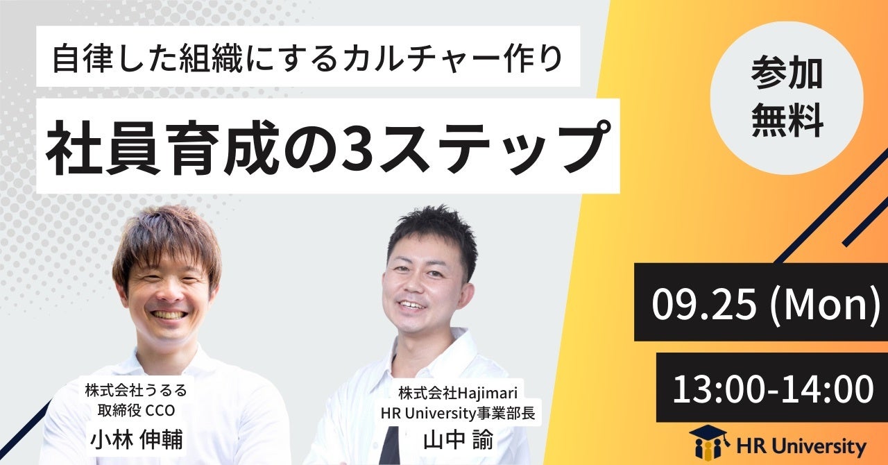 当日は、従業員が増加し続ける中でも高純度での理念浸透を可能とする組織論「シスプス組織」を掲げる、うるる社 取締役CCO小林氏をお招きして、社員育成の3ステップについて余すことなく解説します!