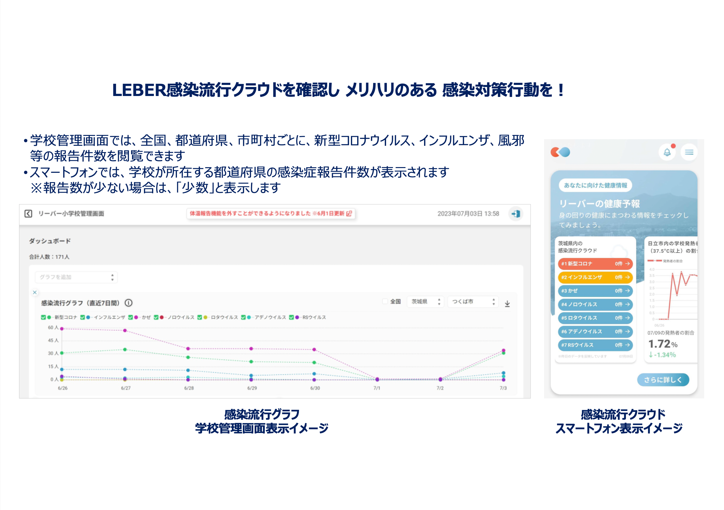 株式会社リーバー(茨城県つくば市、代表取締役:伊藤俊一郎)は、健康観察データから、地域の感染症の流行を早期にとらえる「感染流行クラウド」をユーザー向けリーバーアプリにリリースしました。学校の教職員向けには、リーバー学校管理画面で「感染流行グラフ」を表示し、学校所在地域内外の感染症の報告件数を表示します。