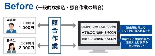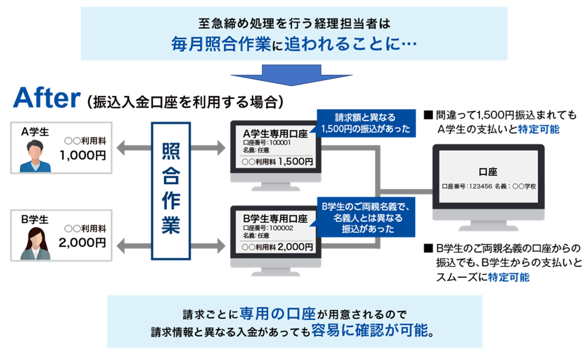 これまで学生宛ての請求を行う際、振込名義人がご両親等の場合、請求されたご本人(学生)からの入金であることを特定するため、振込人名を学生氏名に変更することと、入金目的を明確化するため学生氏名の頭に特定の記号を入力するよう依頼を行っていましたが、当社の振込入金口座をご活用いただくことで、目的別の振込入金口座を発行し、そこにお振込みいただくことで、入金の照合作業がスムーズに行えるようになります。