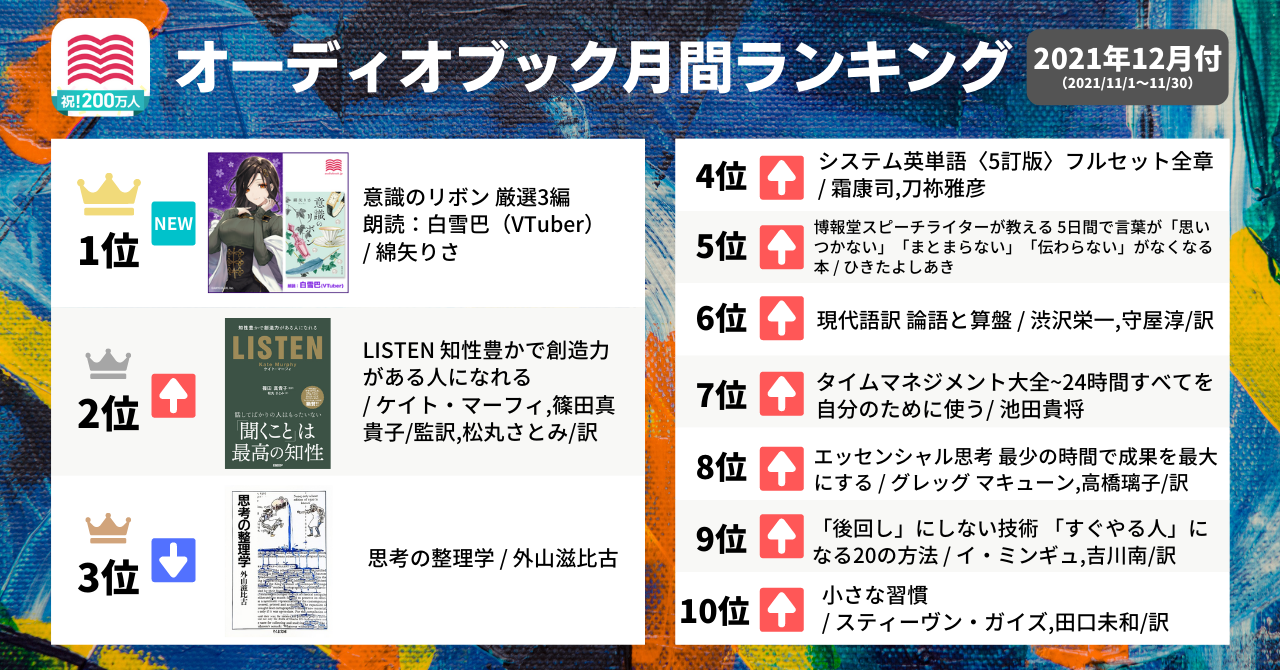株式会社オトバンク( 本社:東京都文京区、代表取締役社長:久保田裕也、以下「オトバンク」)は、当社が運営する会員数が200万人を突破した日本最大級のオーディオブック配信サービス「audiobook.jp」におけるオーディオブック月間ランキング12月付(2021/11/1~11/30)を発表します。