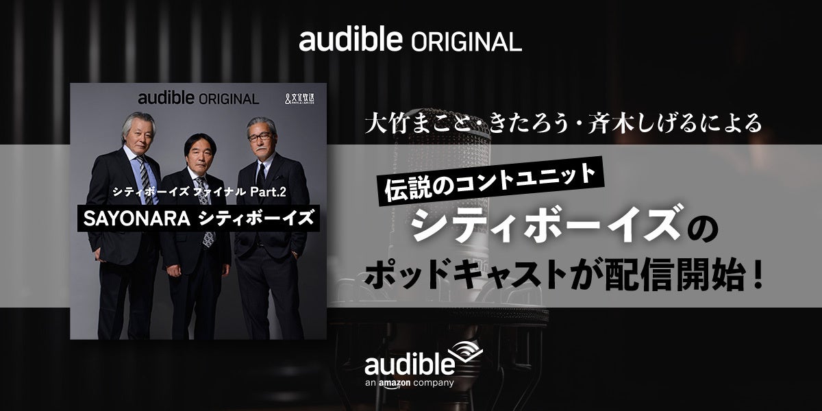 世界最大級のオーディオブックおよび音声コンテンツ制作・配信サービスであるAmazon オーディブル(以下、Audible)は、4月7日からポッドキャスト『SAYONARAシティボーイズ』の配信を開始します。これに先立って本日3月29日、今年2月17日に文化放送で放送されたシティボーイズによる特別番組の一部を、エピソード0として配信いたします。