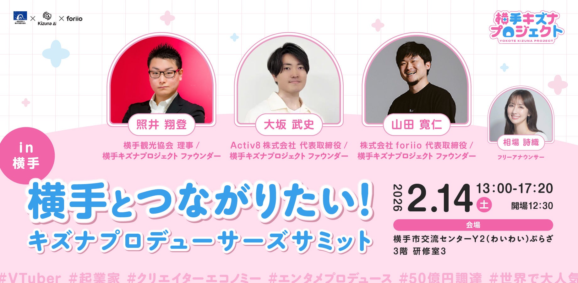 イベント2日目の2月14日(土)には、横手市交流センターY2(わいわい)ぷらざにて、ビジネスパーソンや学生を対象としたトークセッションを開催します。 「VTuberビジネスの最前線」や「地方から世界へ仕掛けるプロデュース論」をテーマに、第一線で活躍する起業家たちが語り合います。