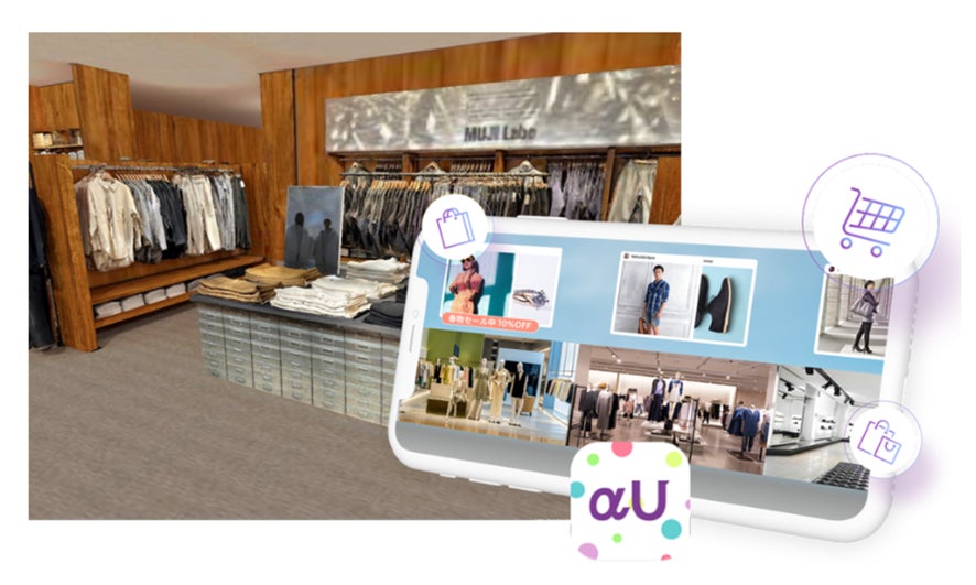 αU placeは、「ネットだけでは商品のイメージがわかない」「店員に相談したい」といったお客さまにおすすめのバーチャルショッピングサービスです。実店舗の空間を商品陳列から内装の雰囲気まで忠実にバーチャル上で再現しているため、商品の置き場所や商品ポップなど実店舗ならではの工夫で注目ポイントを知ることができ、欲しい商品をタップするとECサイトで購入することができます。店内空間は、スマートフォンでスキャンするだけで簡単にバーチャル空間に再現できるため、お客さまは最新の展示を体験できます。