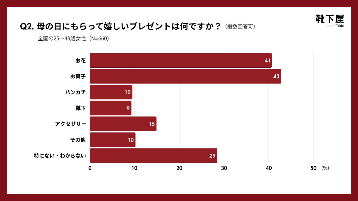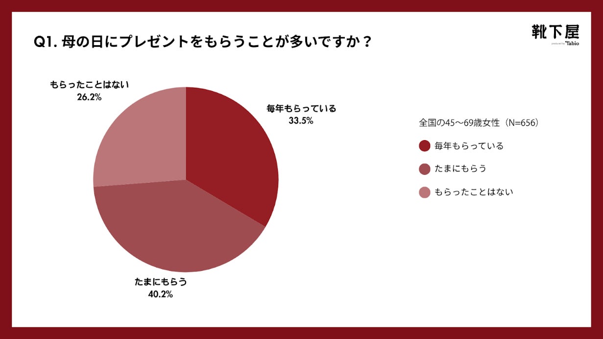 タビオ株式会社(大阪市浪速区、代表取締役社長:越智勝寛)が運営・展開する靴下専門店チェーンの「靴下屋」では、このほど全国の25~49歳の女性660名を対象に「母の日に贈るプレゼントに関する意識調査」と、全国の45〜69歳女性656名を対象に「母の日にもらうプレゼントに関する意識調査」を実施しました。