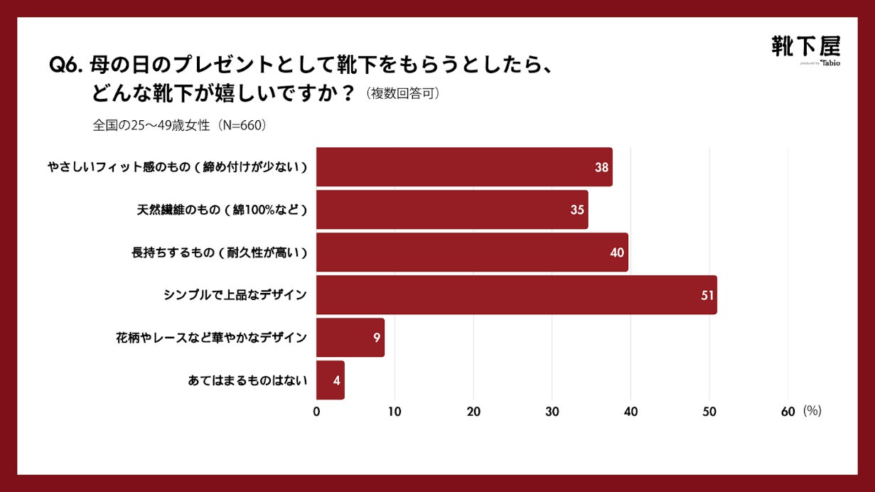 日常で使えるアイテムが求められる今、靴下はハンカチとともにその筆頭ともいえる存在です。今回の調査では、靴下をもらったら「とても嬉しい」「やや嬉しい」と回答した母親が約6割を占めており、華やかさよりも実用性を重視する傾向が浮き彫りになりました。