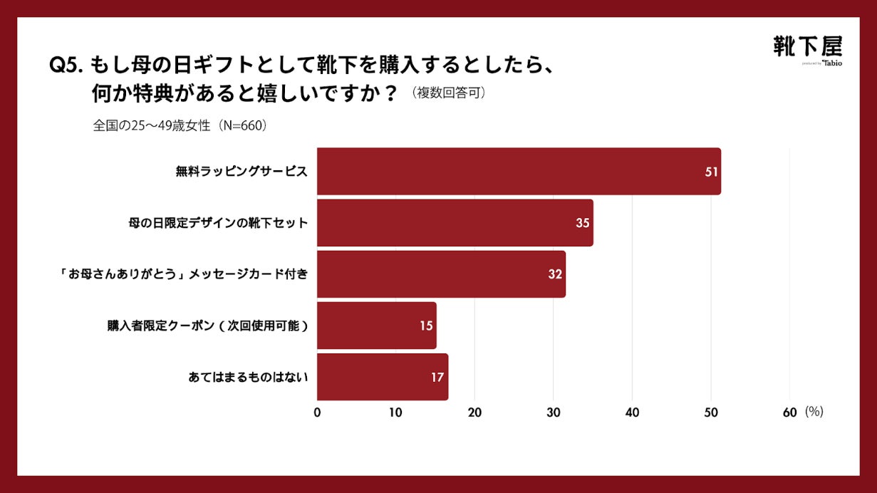 Q5. もし母の日ギフトとして靴下を購入するとしたら、何か特典があると嬉しいですか?(複数回答可)