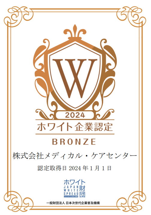株式会社メディカル・ケアセンター様が、一般財団法人日本次世代企業普及機構(通称:ホワイト財団)が運営する「ホワイト企業認定 ブロンズランク」を取得しましたことをお知らせいたします。