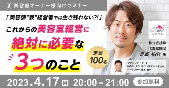 国内最大級の顧客満足度向上プラットフォーム「ファンくる」を運営する株式会ROI(本社:東京都千代田区、代表取締役社長:山口敬人)は株式会社粋(本社:東京都中央区、代表取締役:島崎祐介)の島崎代表をお迎えし、「『美容師”兼”経営者では生き残れない?!』これからの美容室経営に絶対に必要な3つのこと」 (定員:100名/無料)を4月17日(月)に開催いたします。(申し込み先:https://biz.fancrew.jp/seminar20230417_contact?=pr1)