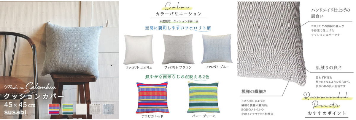 大人気susabiのコロンビアハンモックの生地を使った6種類のクッションカバーの中から、お好きなカラーをお選びいただけます。