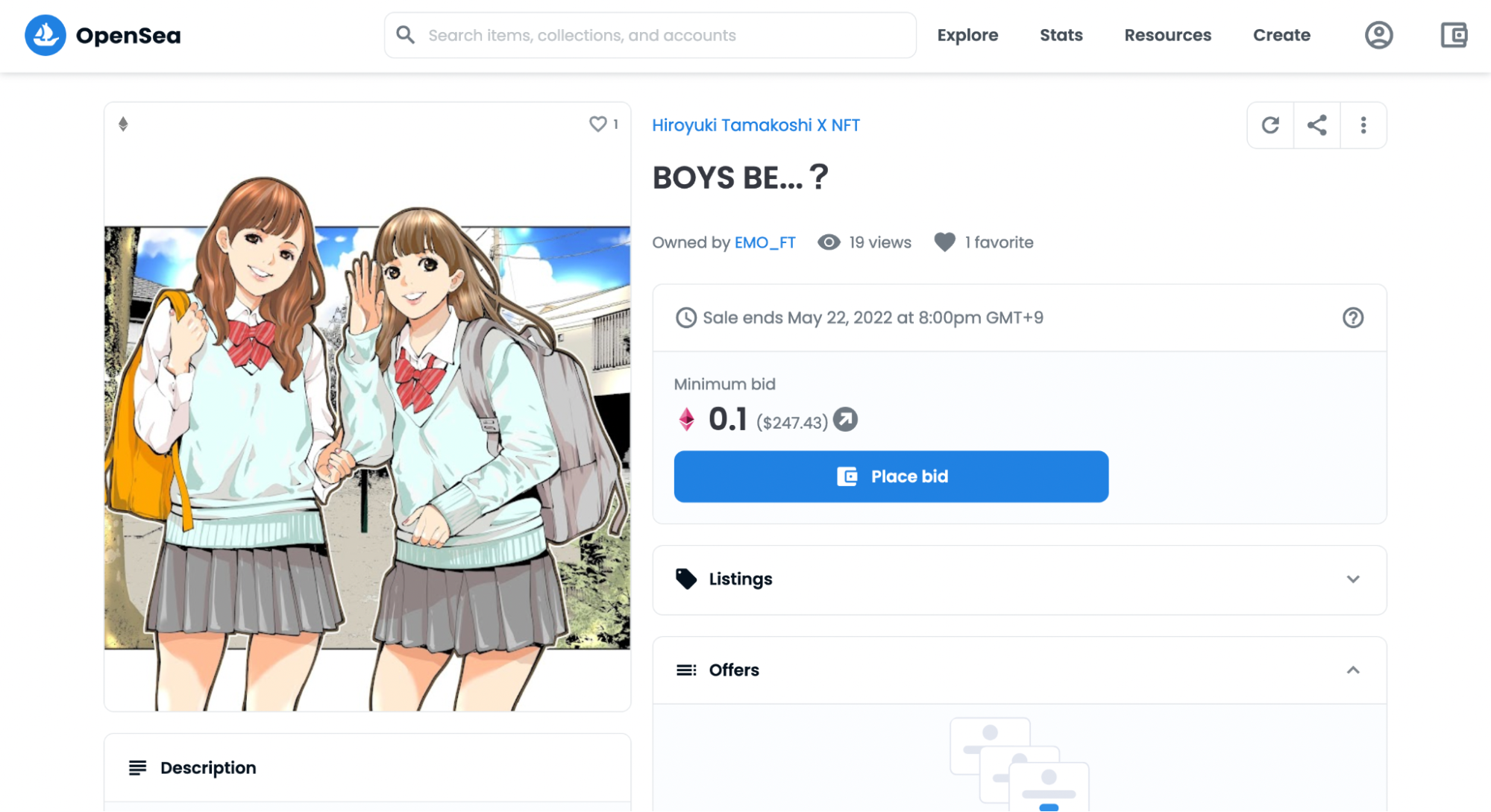ブロックチェーンゲーム、NFTサービスの開発を⾏う、CryptoGames株式会社(東京都渋⾕区、代表取締役:⼩澤 孝太)は、テレビ朝⽇で放送中の新番組 お願い!ランキングpresents「そだてれび」内の企画である「エモエフティー やってみた!」と共同で、NFTマーケットプレイス「OpenSea」における漫画家・⽟越博幸先⽣の書き下ろし作品 「BOYS BE...?」のNFTアートの販売⽀援を実施したことをお知らせいたします。