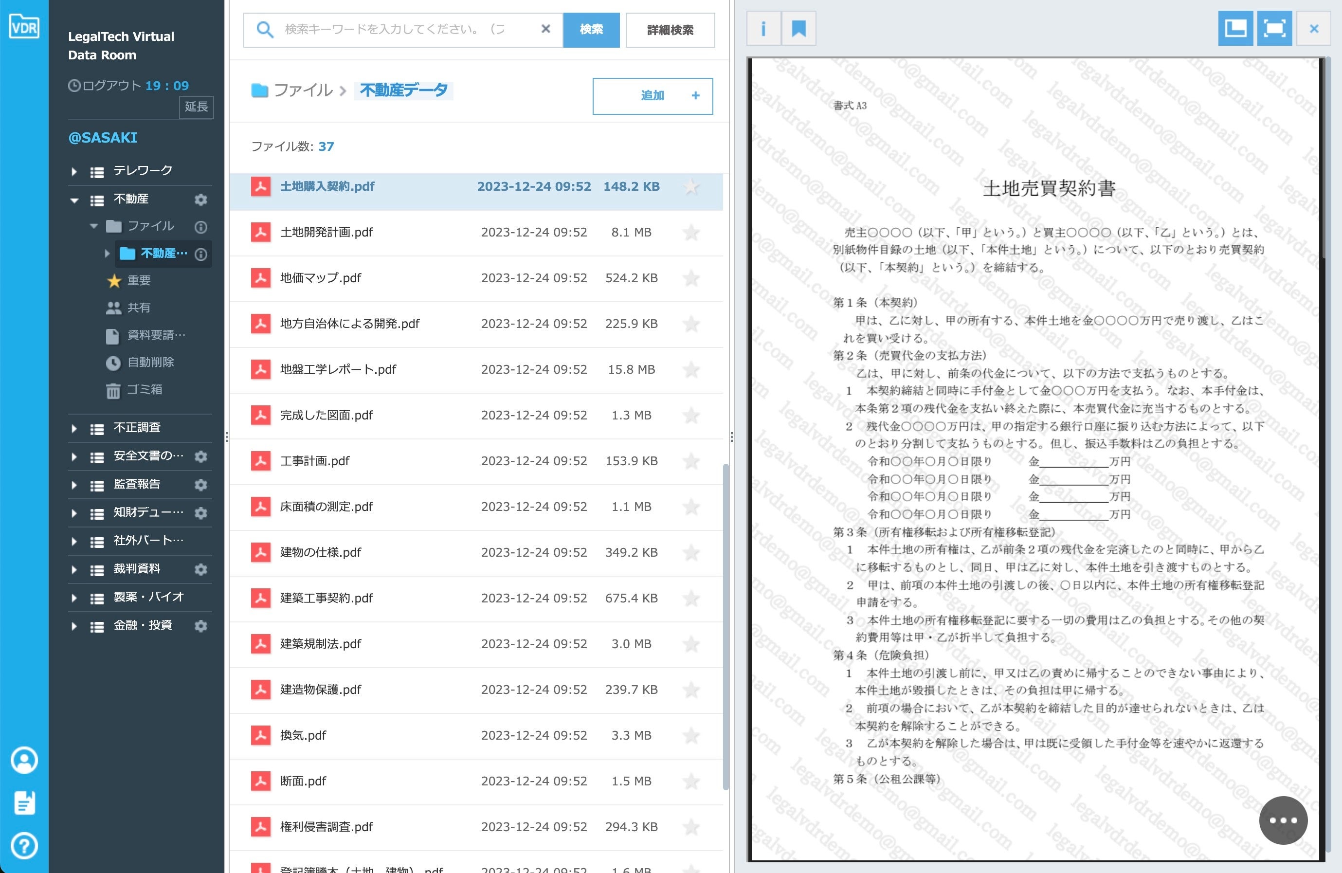 リーガルテックVDR(Virtual Data Room)は、不動産データ共有の課題に対して有効なソリューションを提供できます。以下は、「リーガルテックVDR不動産」が対応可能な主要な機能とその利点です。