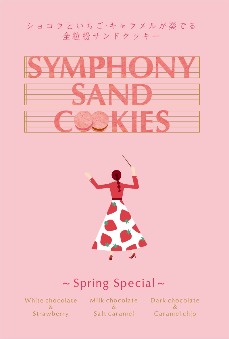 春をイメージした薄いピンクのパッケージに描かれた、多くの素材をまとめ上げる指揮者の女の子は、軽やかな春の風を感じるような苺の可愛いワンピースを着ています。五線譜の上に並んだロゴは、苺果汁入りのザクザクとした全粒粉生地の雰囲気を感じる質感に仕上げました。6個入と10個入の中敷には、お楽しみ入り。何が隠れているかは、ご購入いただいた方だけの特典です。