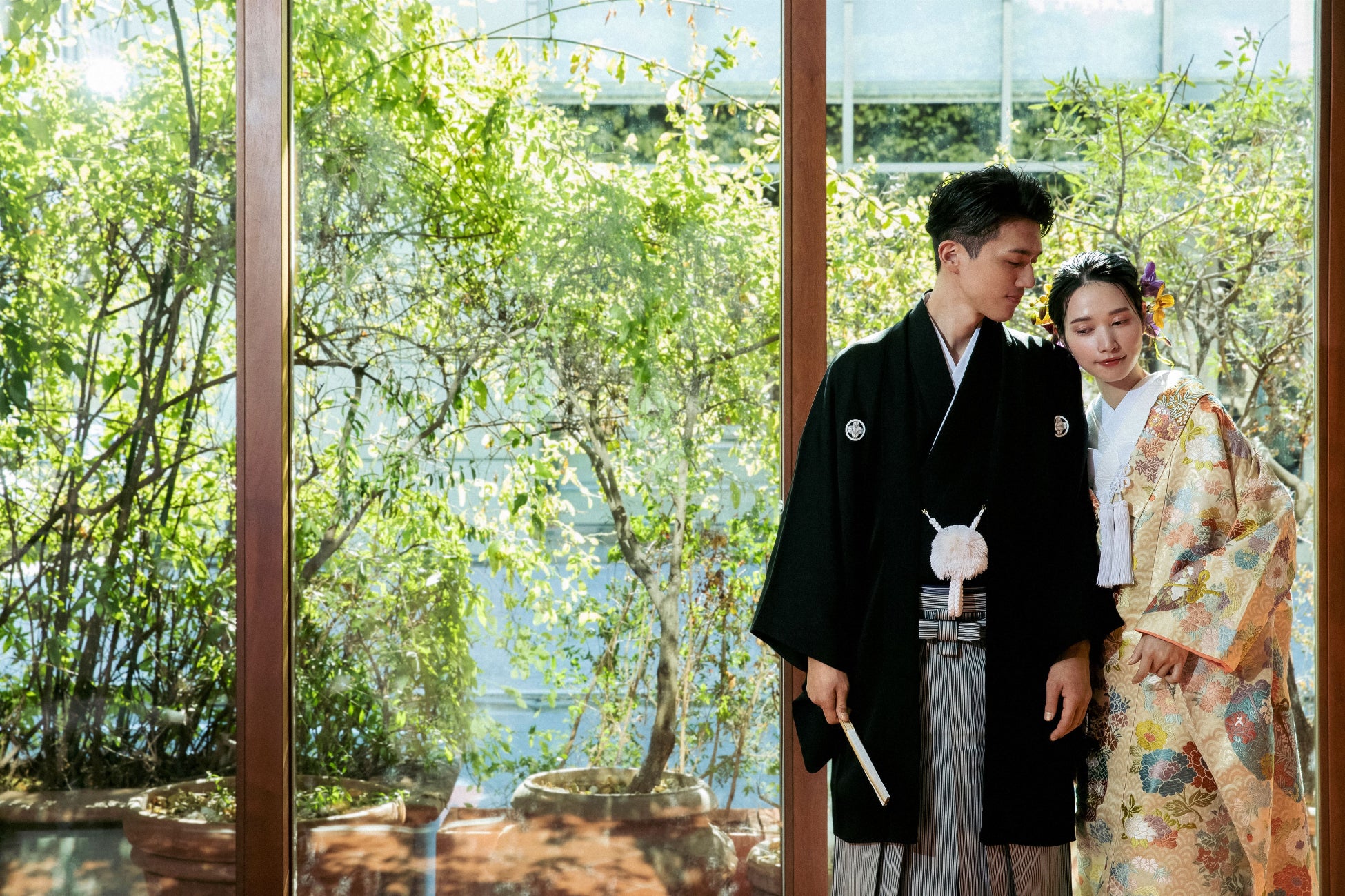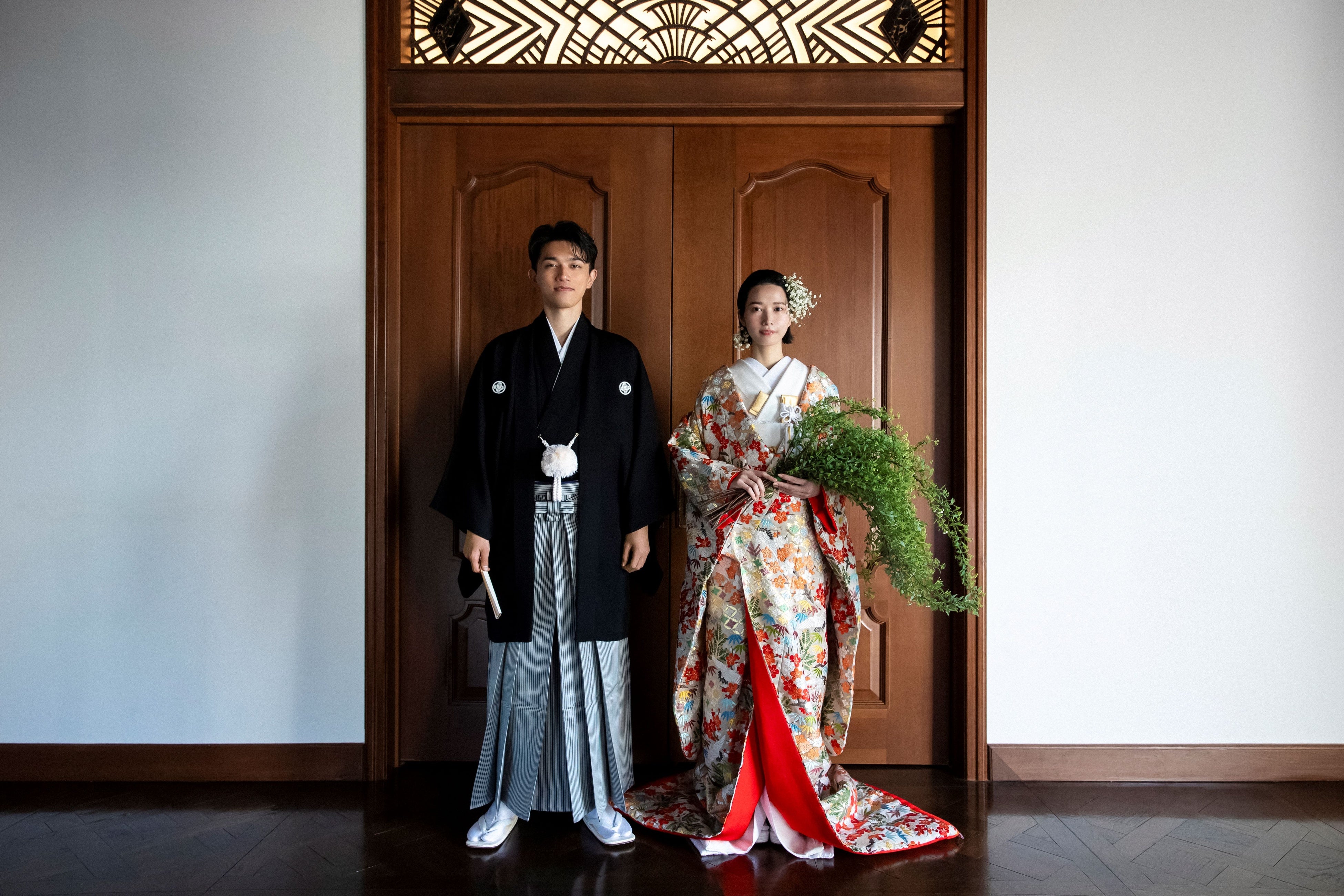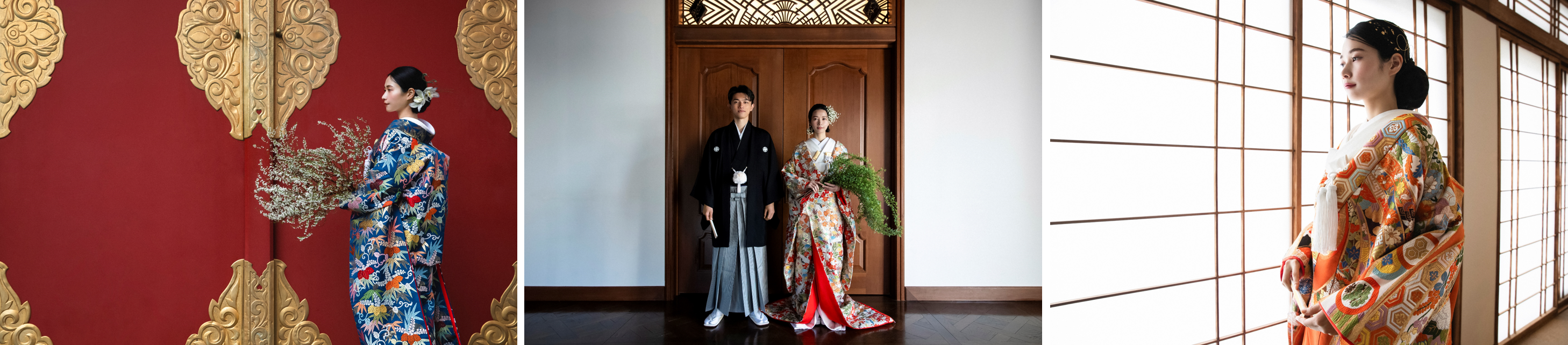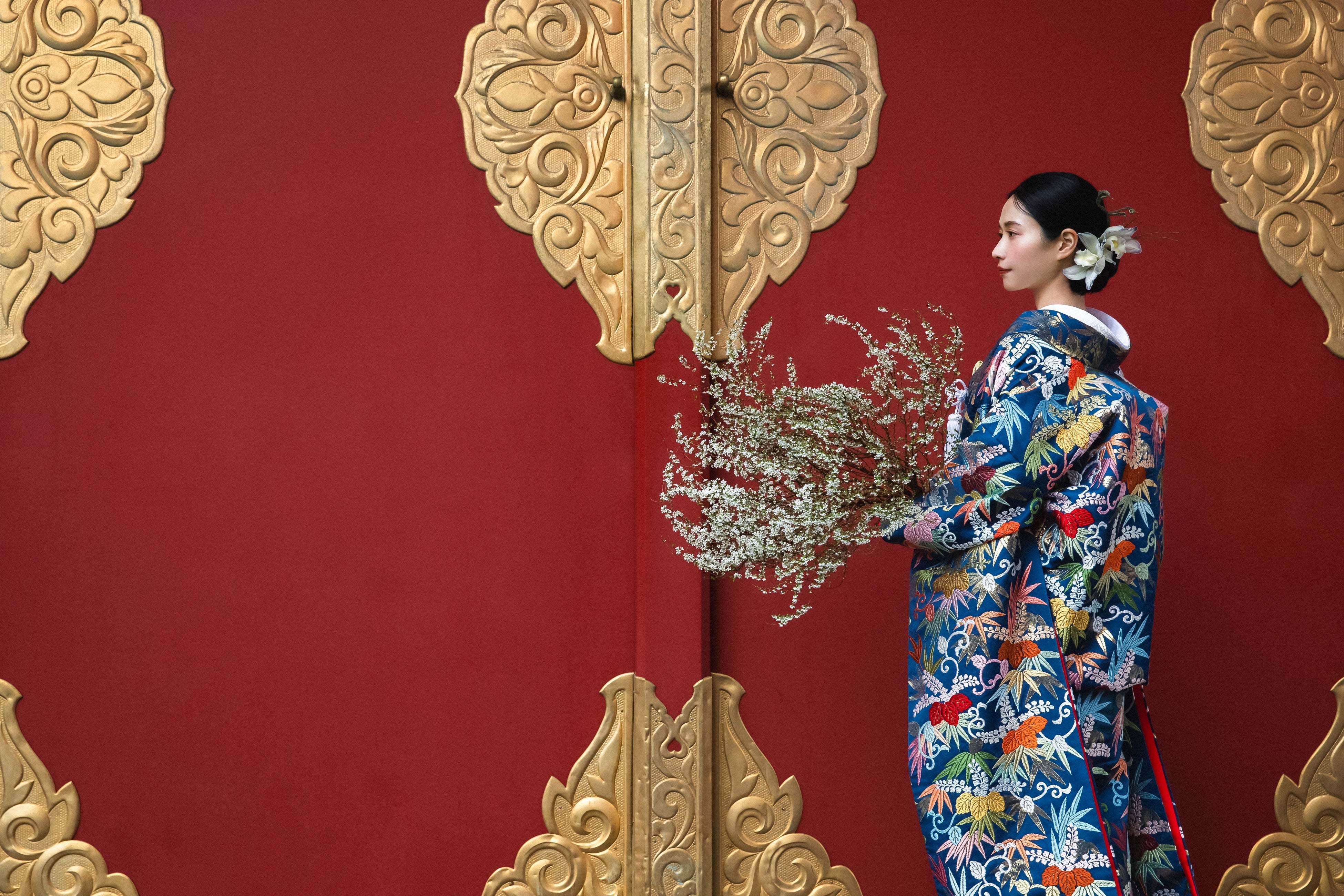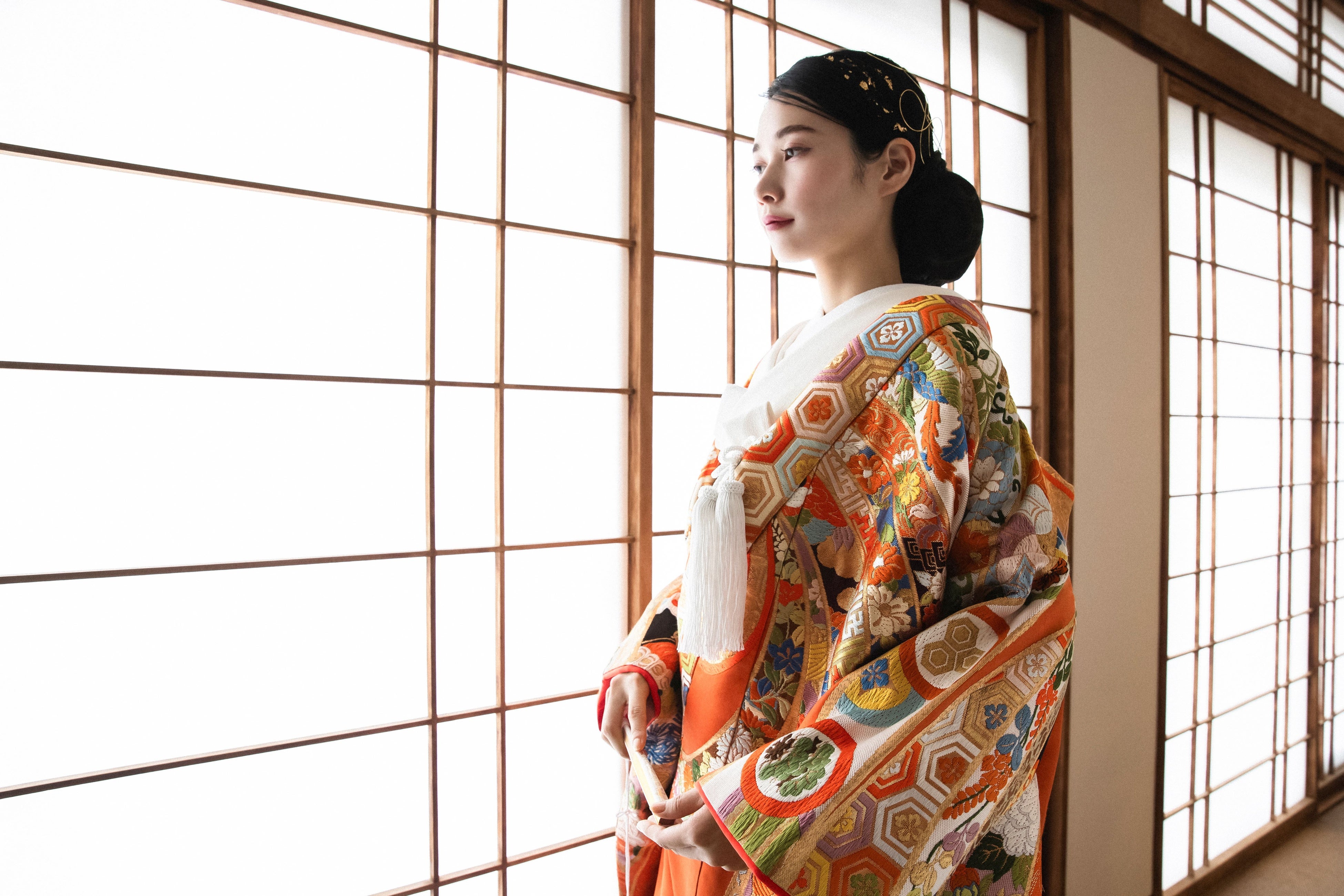 アニバーサリーフォトプランでは、織物の最高級とされる唐織の技法を用いた色打掛や、男性の正礼装である紋付羽織袴など、伝統的な職人の技を感じられる芸術作品のような和装を纏い、特別な日の思い出をお写真として残していただけます。