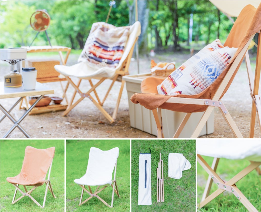 特にチェアは、いつも忙しくしている女性にリラックスしていただけるよう、ハンモックに包み込まれるような座り心地をとことん追求し、何度も女性スタッフに座ってもらいながらサイズ感や素材、カラーを決定しました。また、フレームはあたたかみある質感の天然木を採用。キャンプ場はもちろんのこと、庭先でのティータイムや室内でも使いたくなるデザインが特徴的です。持ち運びも簡単なので、星を眺める、お茶を飲む、本を読む…など、いつでもどこでもゆったりした時間を楽しんでいただける商品となっております。